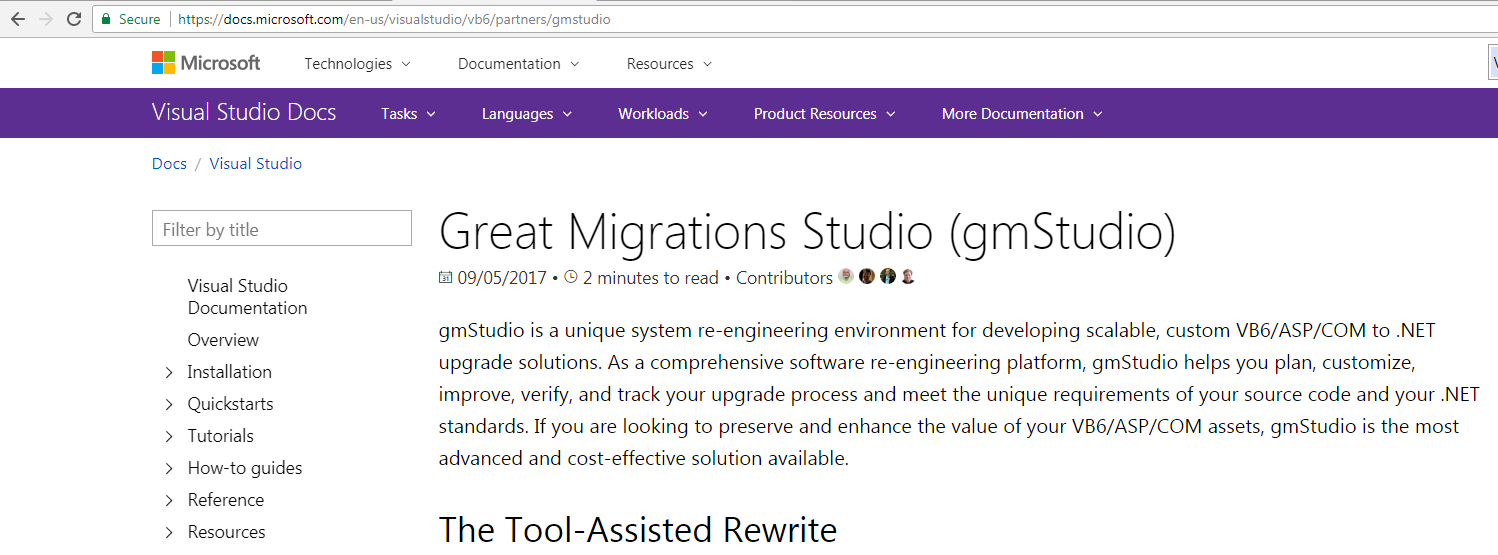 Microsofts Visual Basic 6.0 Resource Center now offers a free license to the “Great Migrations Studio”. gmStudio is a code translation and re-engineering tool for developing scalable, custom VB6/ASP/COM to .NET upgrade solutions. Though limited to 10,000 lines of code, this license will get teams started with upgrading VB6 applications to VB.NET or C#. It will also provide an opportunity to evaluate the benefits of investing in a larger license or a license for the ASP-to-.NET upgrade feature.