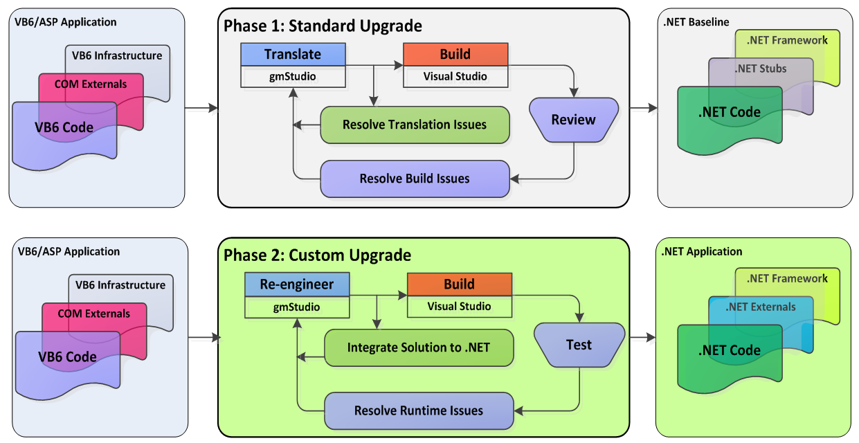 Section titled “Phase 1 - Standard Upgrade”The goal of the Standard Upgrade is to rewrite the VB6/COM Source Baseline to a .NET Baseline that builds without errors. The major tasks of this phase are as follows:
