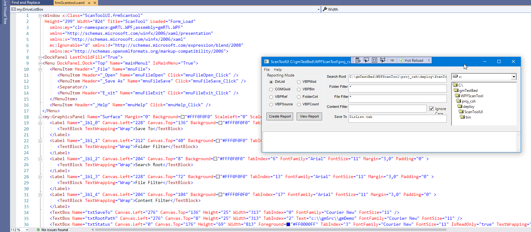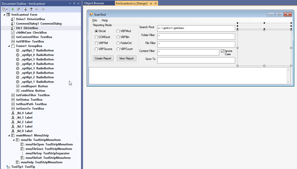 For example, here is a screen shot of the default (OOTB) ScanTool UI translation. Note that all of the controls are in the Document Outline even though the DriveListbox and FolderListbox render as transparent rectangles. This version does not run because it is linked to a stub framework.