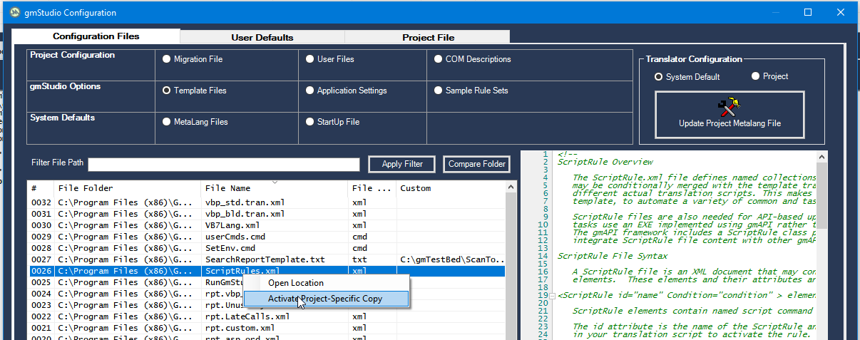 ScriptRule files are also helpful for API-based upgrades tasks. These tasks use an custom migration executable implemented using gmslAPI rather than gmBasic. The gmslAPI includes the ScriptRule class to assist with preparing a ScriptRule file content for use by the gmslAPI services.