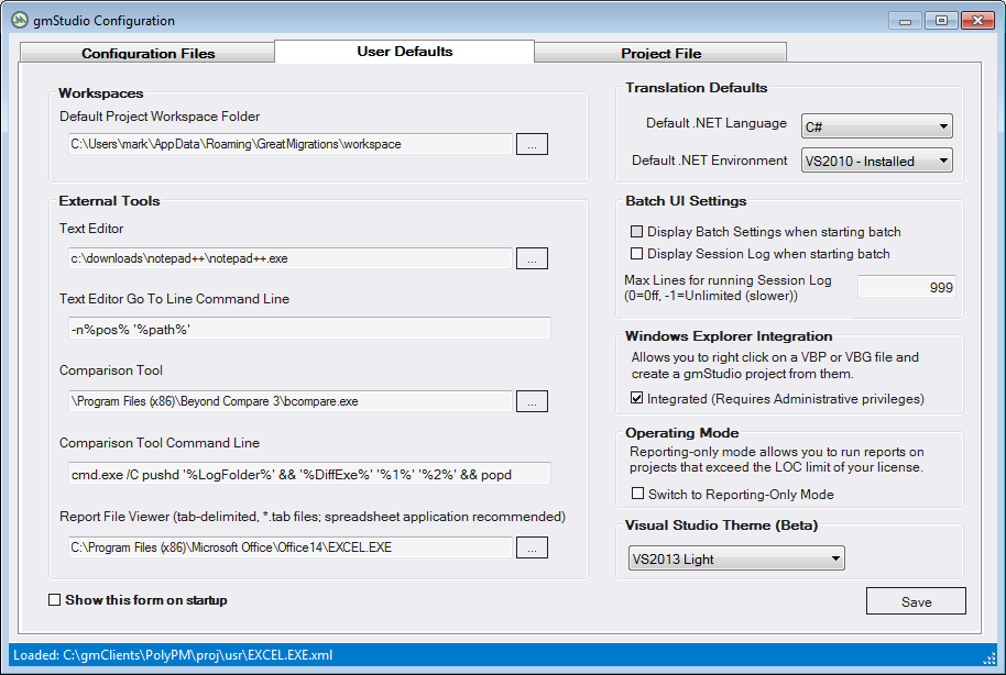 Section titled “User Defaults Panel”The User Defaults Panel facilitates editing the most frequently customized application configuration settings. Clicking [Save] writes these settings to the application config file.