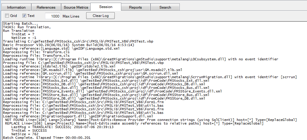 - A Migration Task Details Panel, which allows access to an extensive array of information associated with each migration task. It also contains a session log viewer and a powerful code search reporting tool.