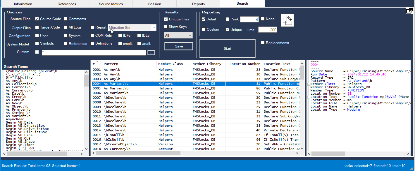 - Source Code indicates that the source code associated with the selected migration tasks will be searched.