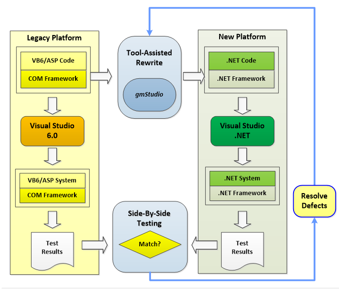 Section titled “Side-by-Side Testing”Verifying that the .NET codebase is functionally equivalent to the source codebase is of paramount importance to any migration effort. The tool-assisted rewrite methodology makes this much more attainable than a from-scratch rewrite because you will be using the original source as the functional specification of the new code. The original source is be definition the most accurate specification of what the original application does and it describes it in extreme detail.